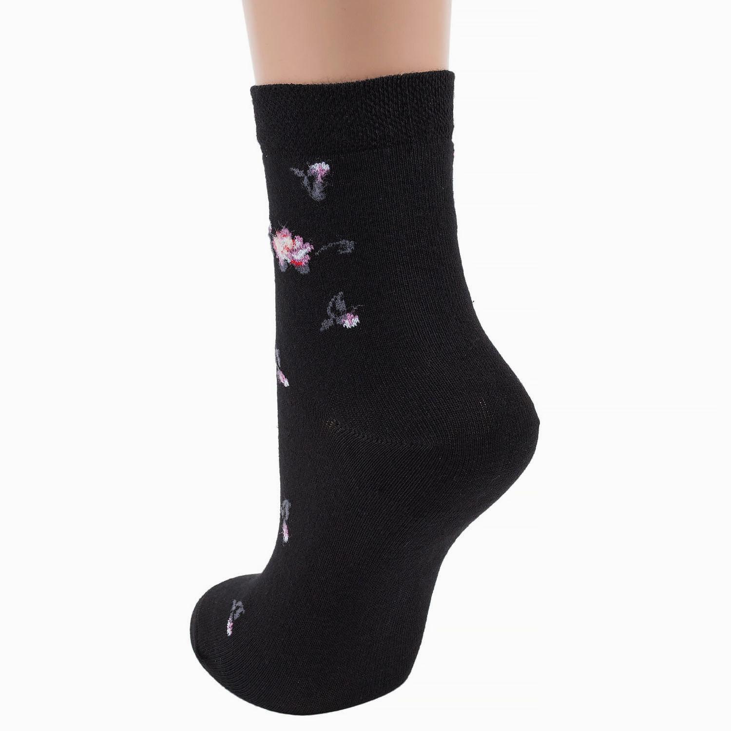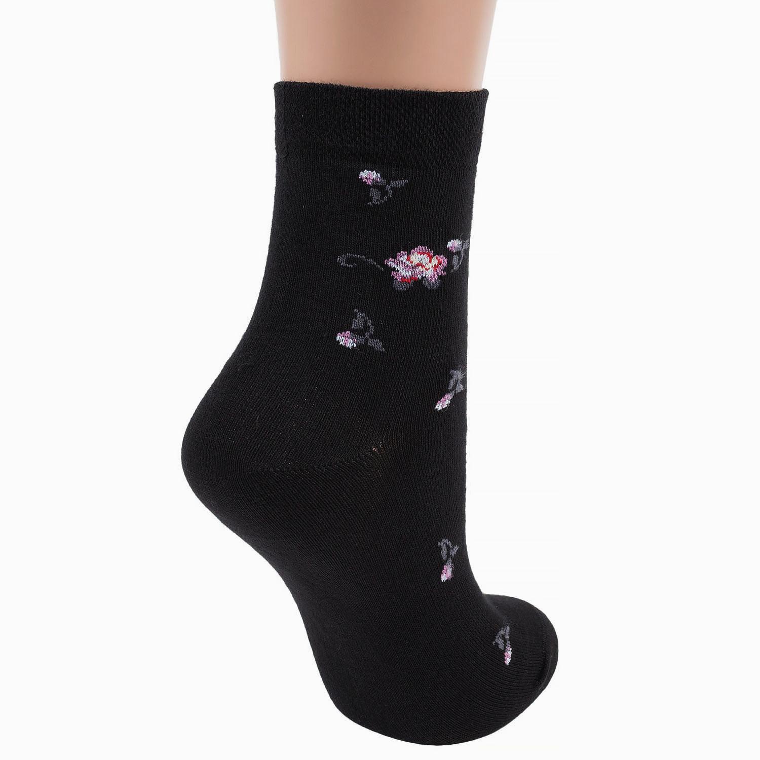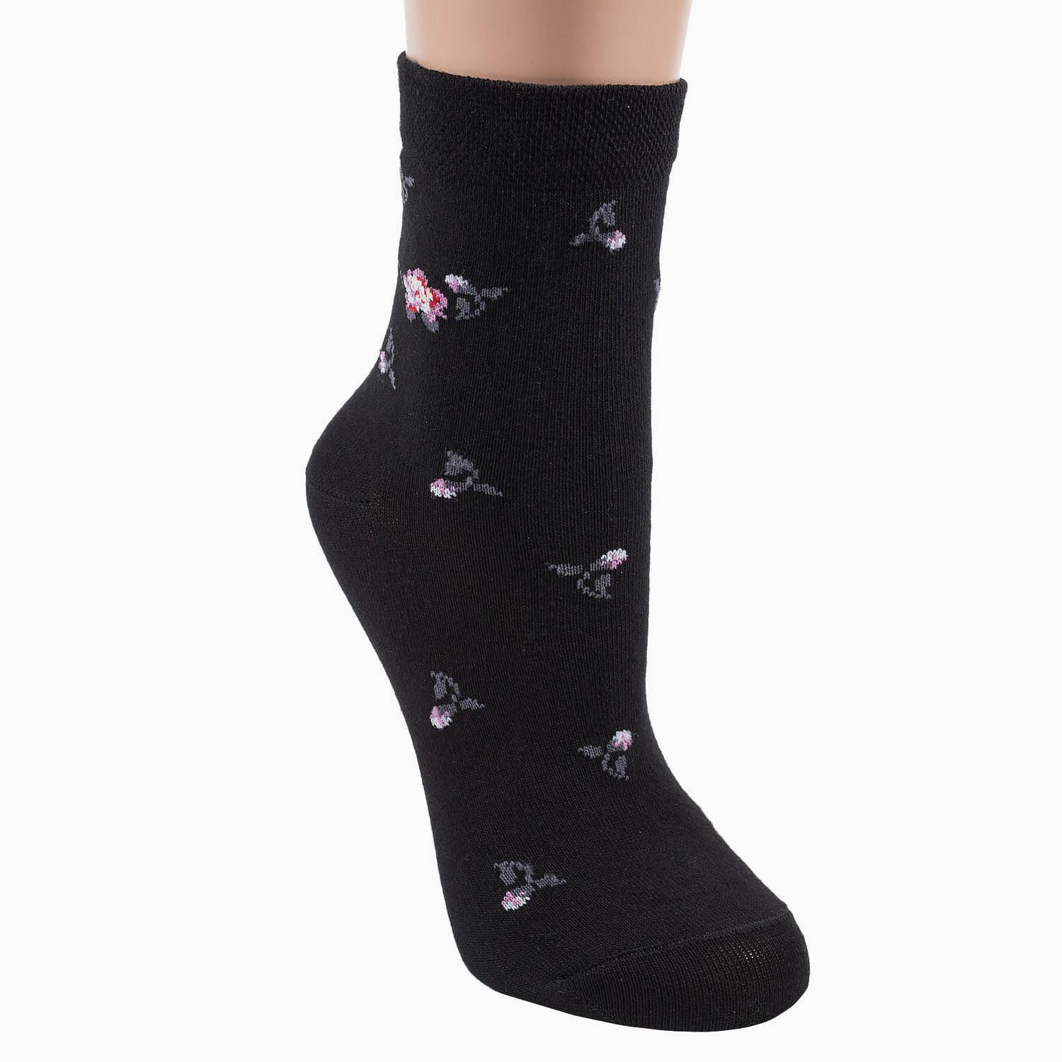 Высококачественные женские носки классической длины, оформленные контрастными флористическими узорами. Они изготовлены из очень качественного трикотажа и отличаются удобной мягкой резинкой.