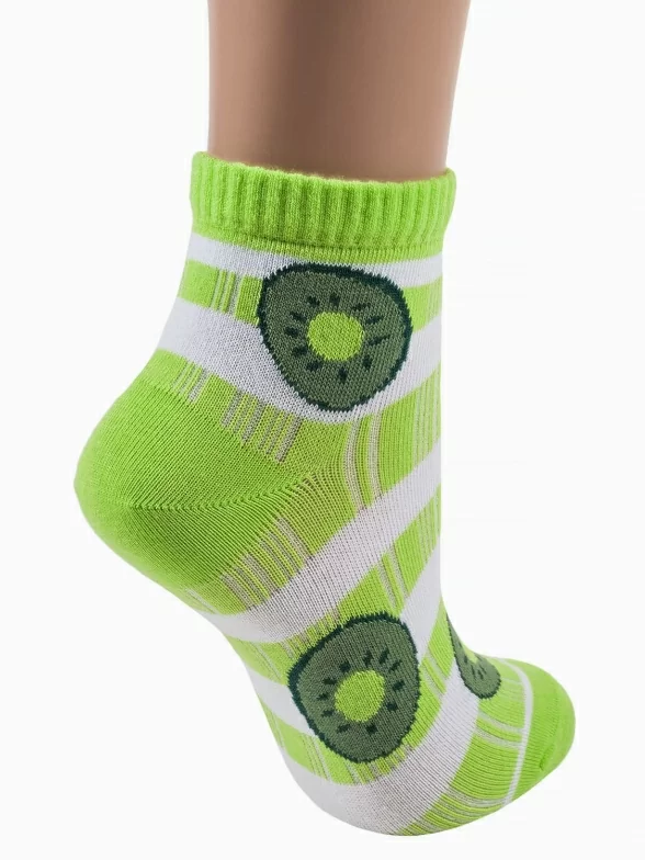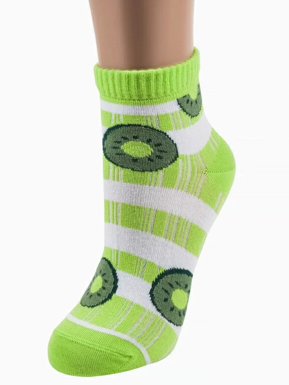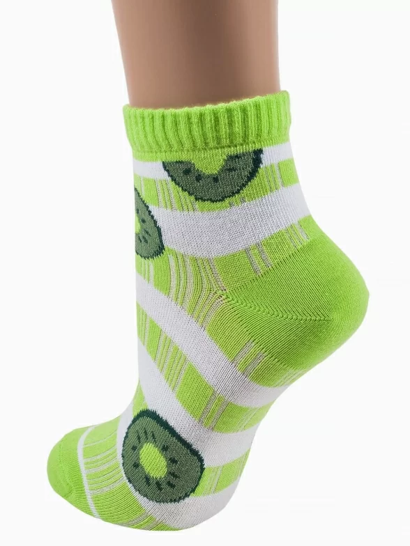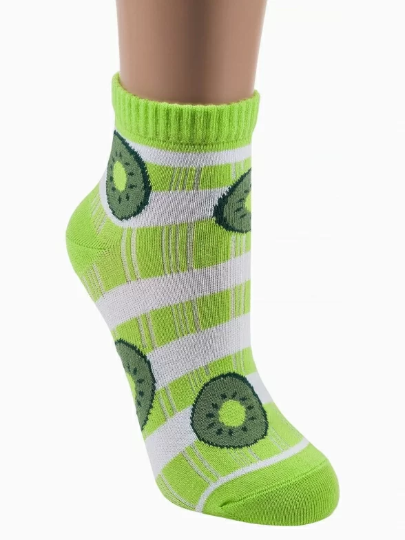 Стильные женские носки в сочной расцветке! Они оформлены принтом со спелыми зелеными киви на фоне широких чередующихся полос. Удобная вязанная резинка не создает излишнего давления на кожу. Носки отлично тянутся и приятны к телу.