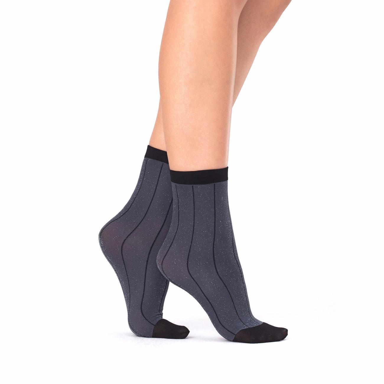 Укороченная модель плотностью 40 den без отдельно вывязанной пятки украшена люрексовой нитью, дающей эффект мерцания. Изготовлена в Польше из гладкого синтетического волокна на основе полиамида с добавлением эластана, за счет чего носки достаточно износостойки и хорошо тянутся.