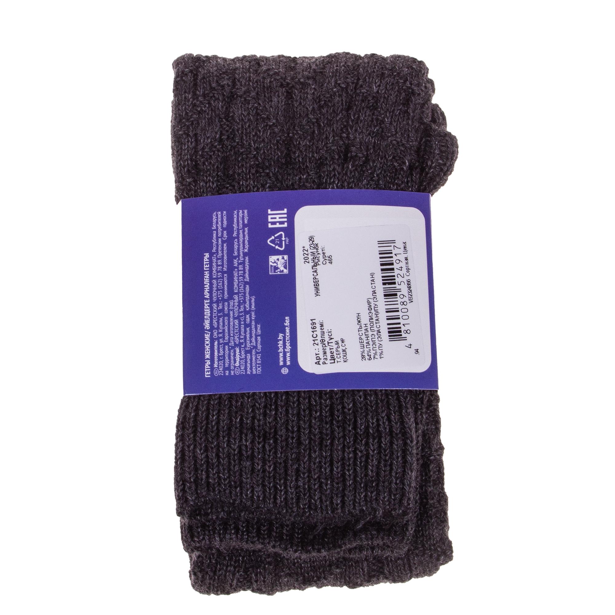 Женские гетры, цвет темно-серый,, принт (рисунок): с узором, однотонный, состав: 64% ПАН, 28% шерсть, 7% полиэстер (полиэфир), 1% эластан, арт. 21С1691. Производитель «Брестский чулочный комбинат ОАО, Беларусь» под брендом «Брестские (бчк)».