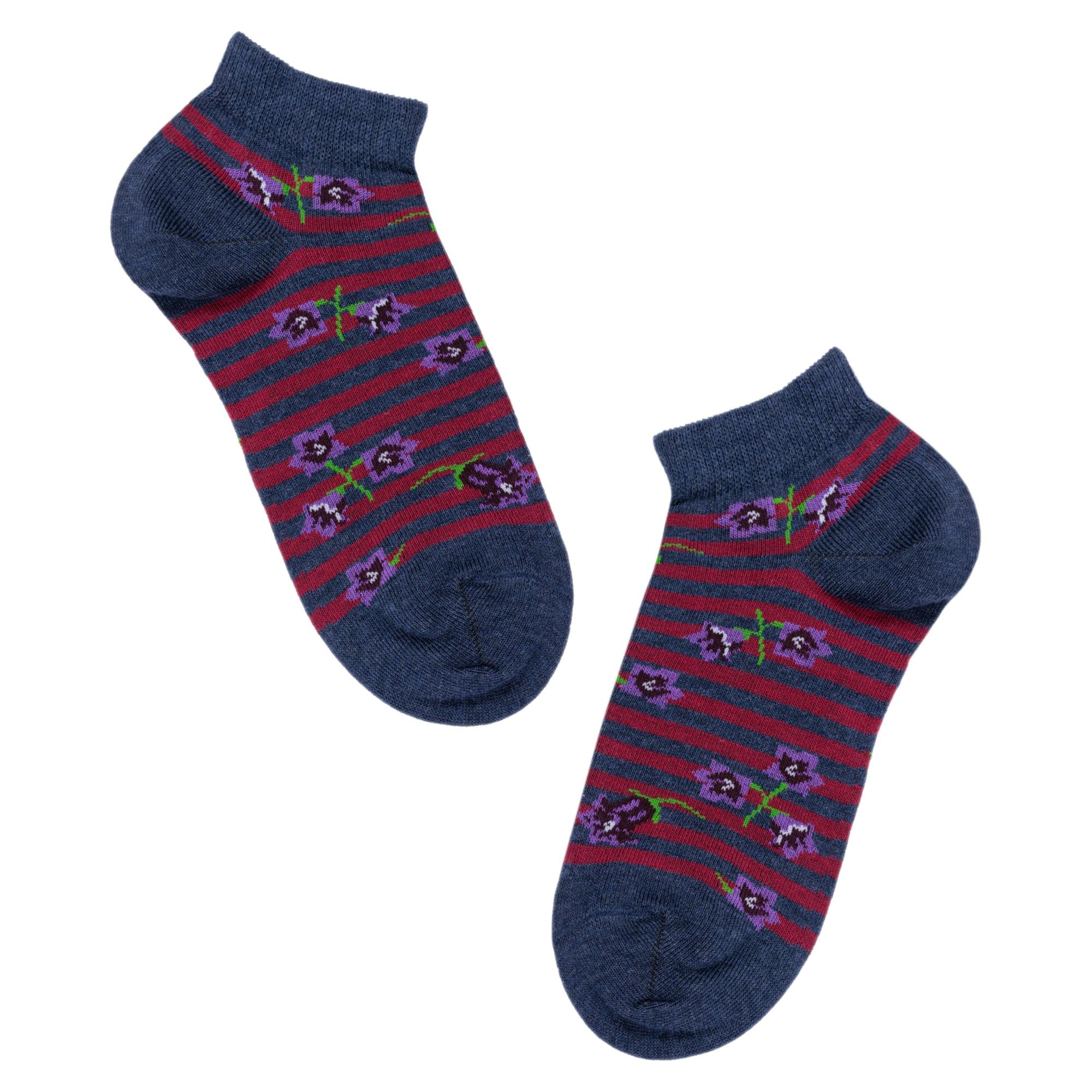 Круглогодичные или летние короткие женские носки, цвет многоцветные (мультиколор), повседневные, шов кеттельный (бесшовная технология), принт (рисунок): цветы / растения, с узором, состав: 66% хлопок, 32% полиэстер, 2% эластан, арт. 14С1101. Производитель «Брестский чулочный комбинат ОАО, Беларусь» под брендом «Брестские (бчк)».